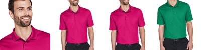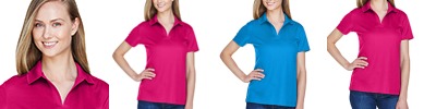 5.1 oz./yd2 / 172 gsm, 100% polyester face plaited to 60% polyester, 40% cotton back (total overall garment 61% polyester, 39% cotton) with moisture-wicking performance; Proprietary dual-sided mesh pique knit constructed of fine denier wicking polyester on the outside and soft-as-cotton wicking blend on the inside; Matching flat knit collar; Luxury, comfort and performance in one; Three-button placket; Dyed-to-match buttons;