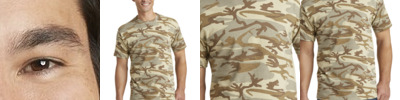 5.4 oz., 100% cotton; No two patterns are exactly alike; Double-needle white stitching throughout; Seamless rib at neck; Shoulder-to shoulder tape; Wash separately;