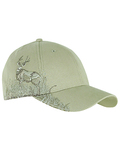100% polyester; Structured front; Pre-curved visor; Hook and Loop backstrap; Detailed embroidered wildlife scene on right side; Dri Duck embossed leather patch left of back vent;